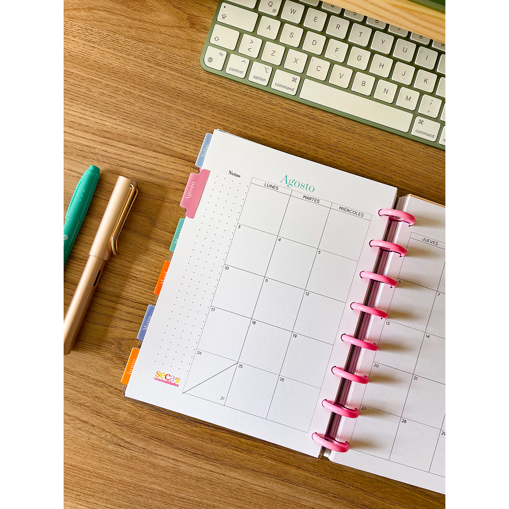 - Tamaño B5 (18x26cm), con tapa termolaminada rígida 250mic y sistema inteligente de discos (se pueden sacar y volver a poner las hojas)